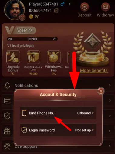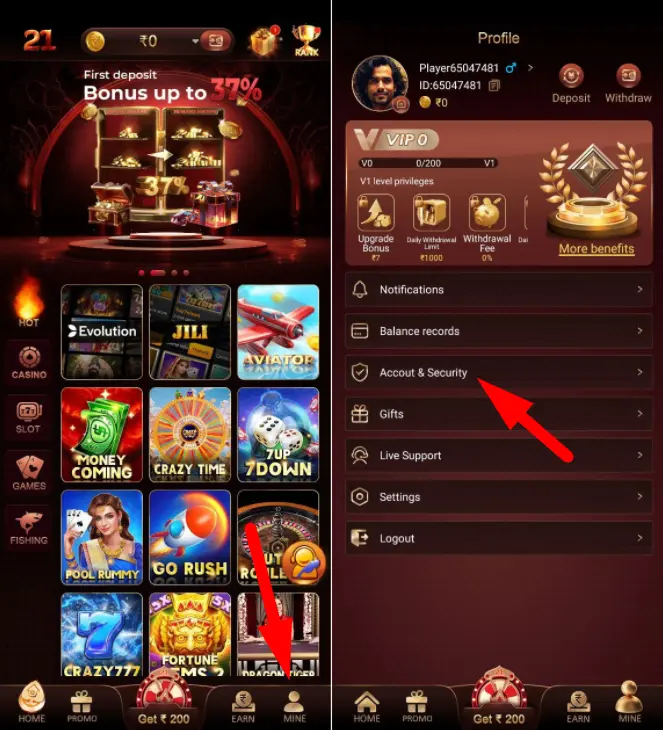 21 GAME ओपेन करना है | निचे दये तरफ कॉर्नर में MY PROFILE पर क्लिक करना है | ACCOUNT & SECURITY पर क्लिक करना है | BIND MOBILE NUMBER पर क्लिक करके मोबाइल नंबर, और OTP डालकर SUBMIT बटन पर क्लिक करना है.